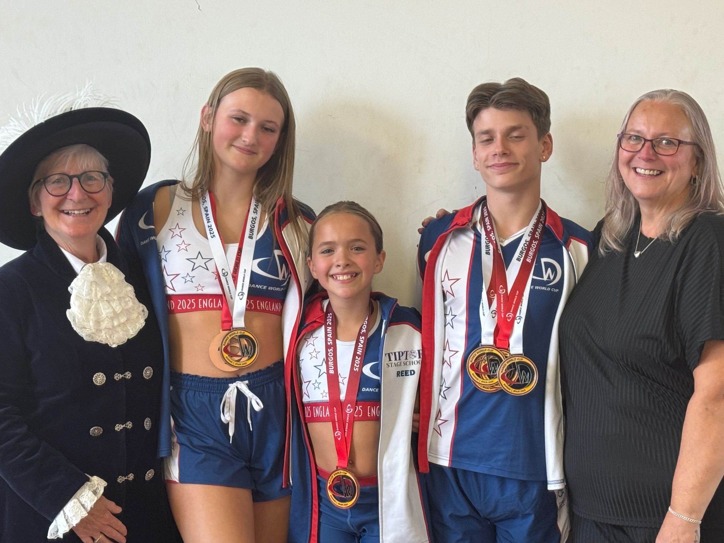 So proud that the High Sheriff Of Essex came to celebrate their success at the Dance World Cup 2025. Pictured here with Molly, Reed, William and principal Julie.